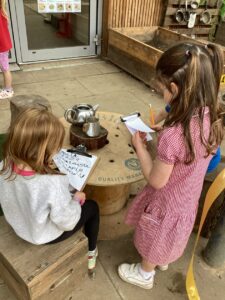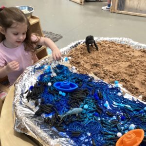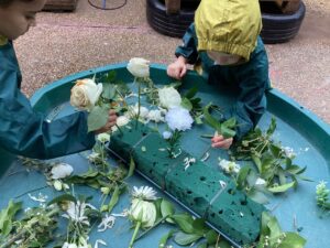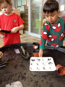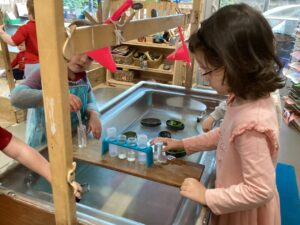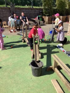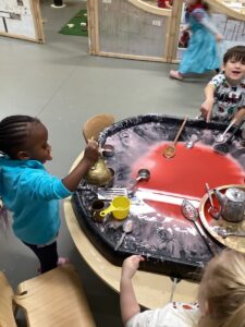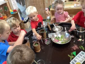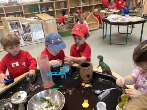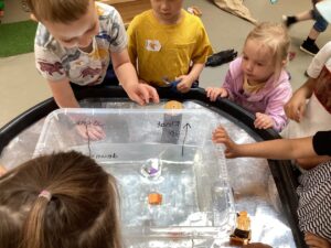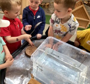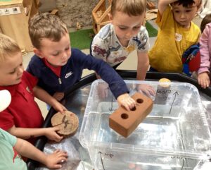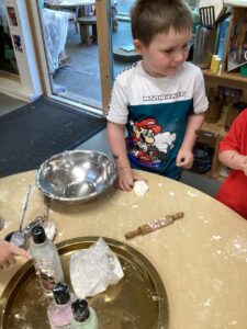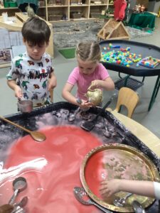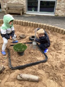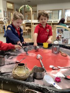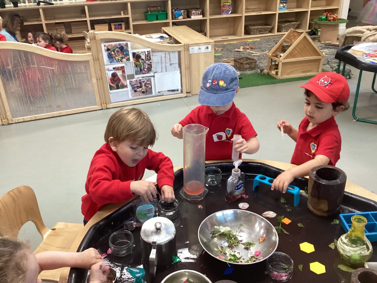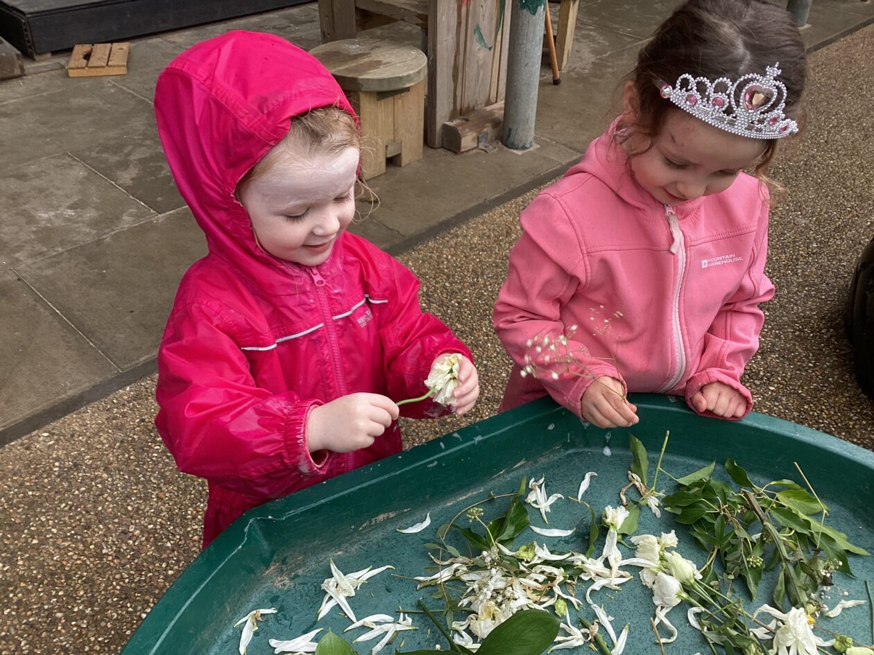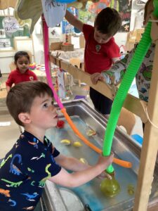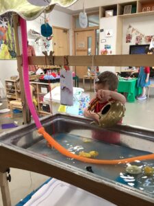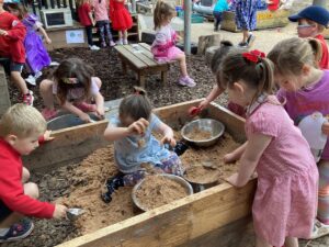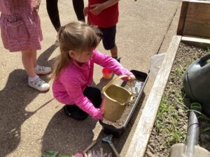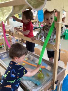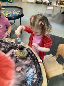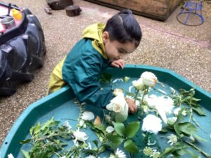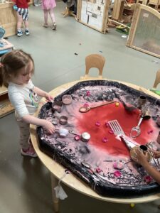 In the water we have been exploring the senses of smell, sound and sight. We have been adding various food elements and the children have been using descriptive language to describe what the smell, see and hear. We have made fizzy oranges, orange and nectarine water and, mint and cucumber water, made perfumes from different herbs and essences.
