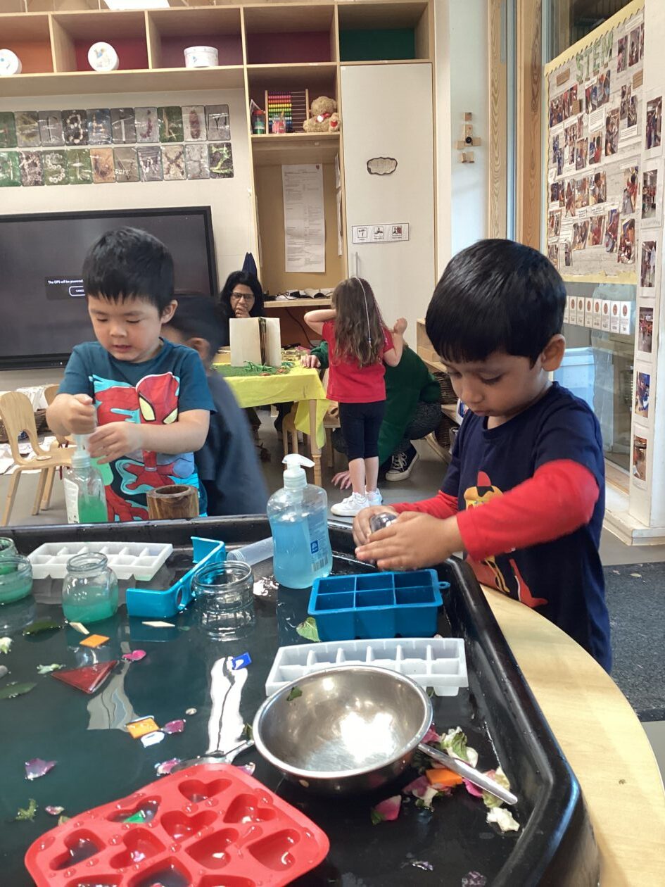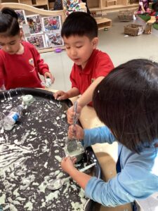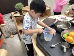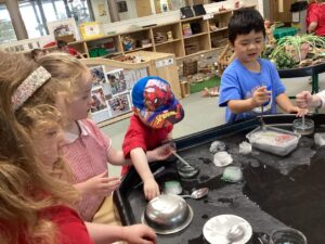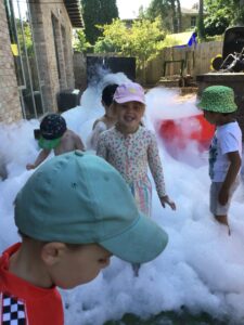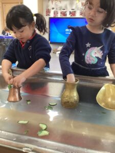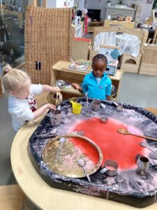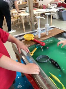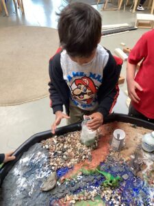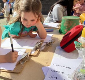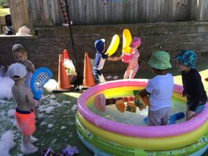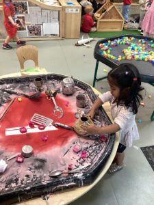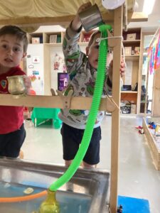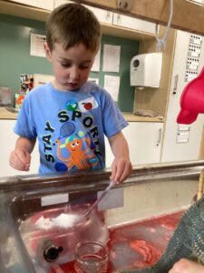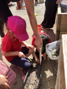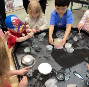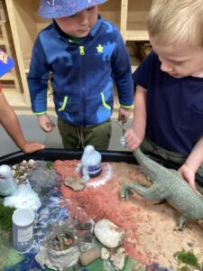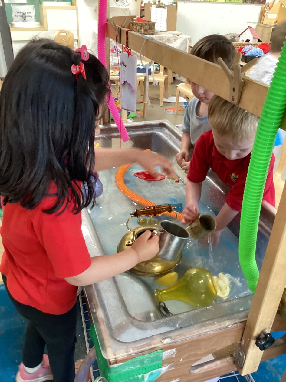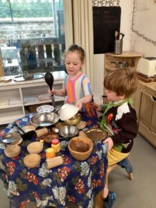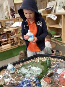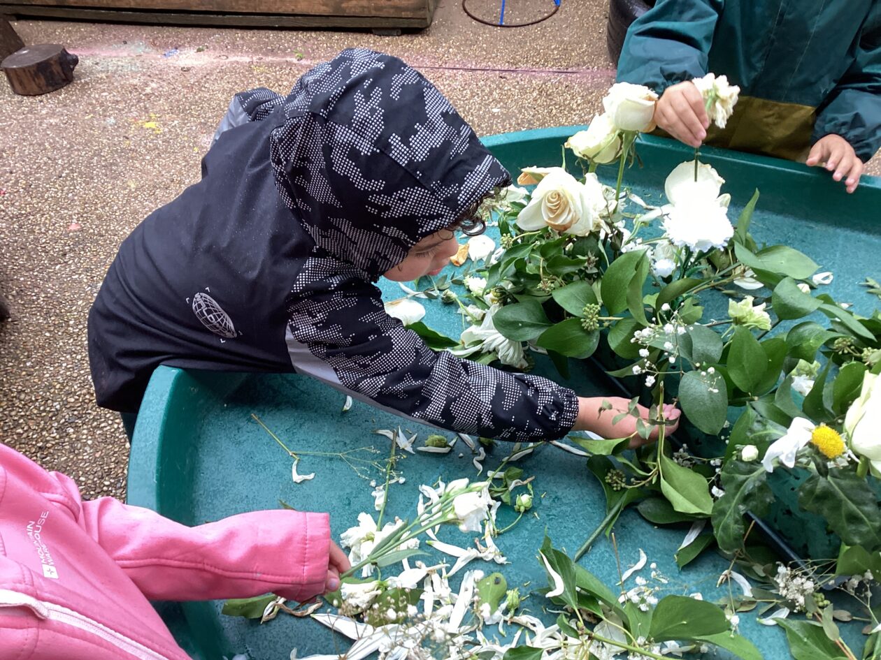 In the water we have been exploring the senses of smell, sound and sight. We have been adding various food elements and the children have been using descriptive language to describe what the smell, see and hear. We have made fizzy oranges, orange and nectarine water and, mint and cucumber water, made perfumes from different herbs and essences.