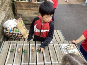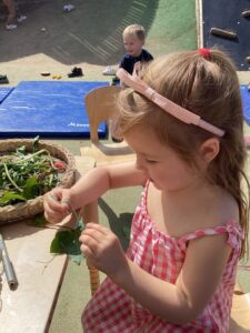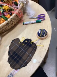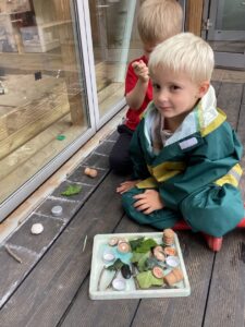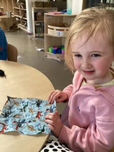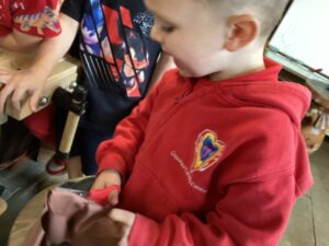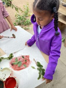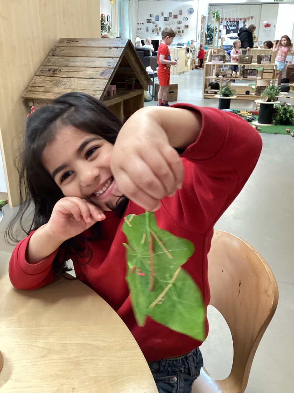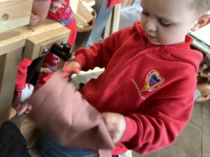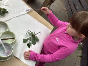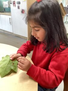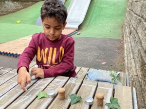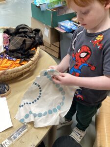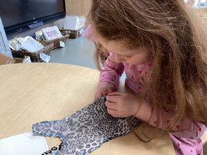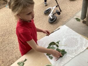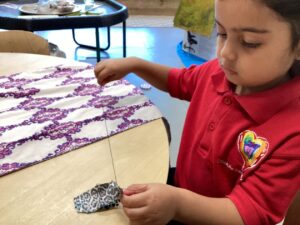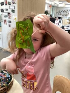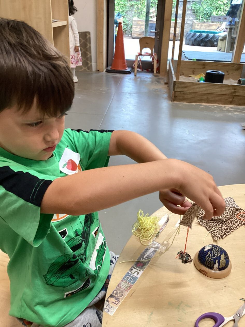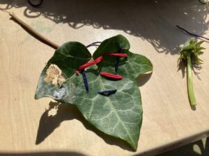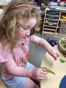 This week in the sewing area, inspired by their time spent outside in the garden, the children have explored sewing with natural materials. The children  helped to gather materials for their transient art and explored creating their marks on leaves with their stitching and added additional details with the addition of fabric embellishment. Whilst making their creations we discussed the different parts of the plant and how the seasons might affect them. We did some extra research using the ipads to explore different insects that might live on our plants and also explored some similarities between ourselves and leaves, looking at the finer details such as the veins on the leaves.