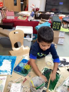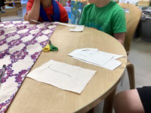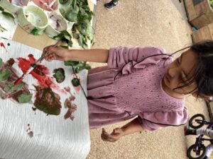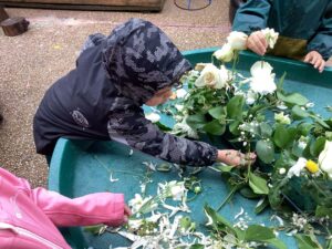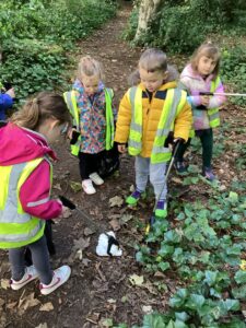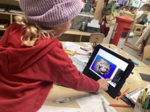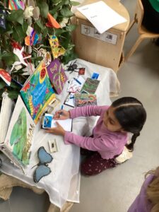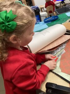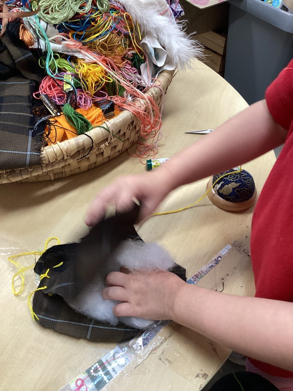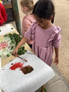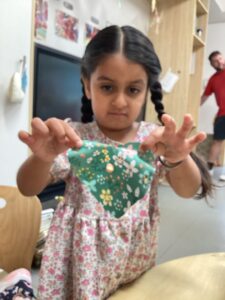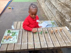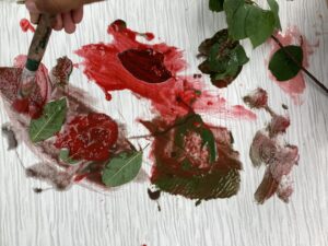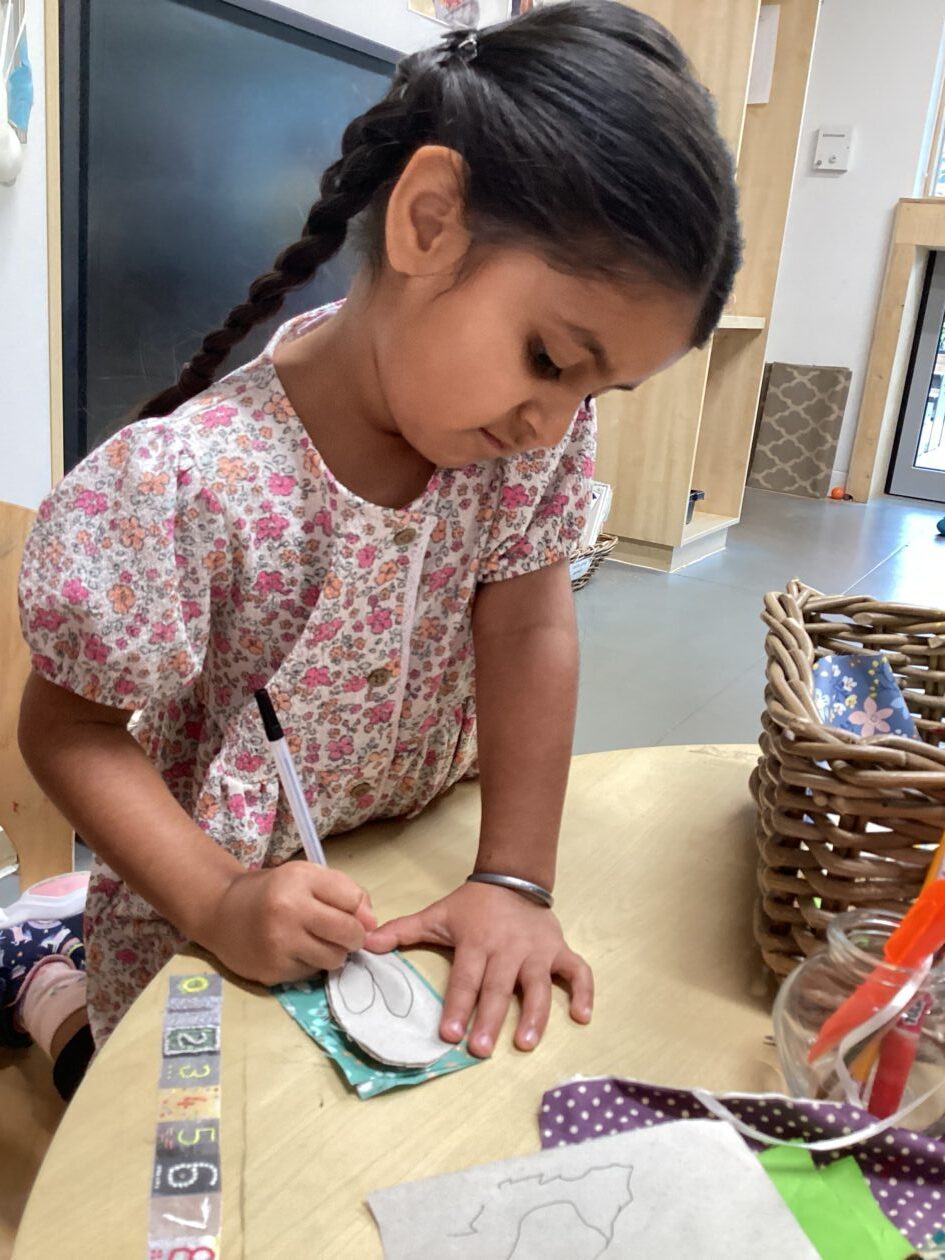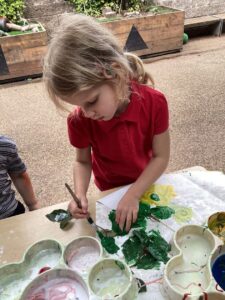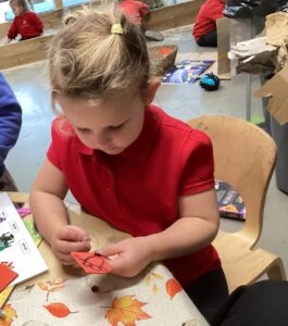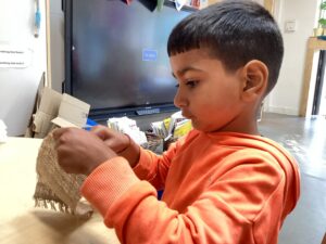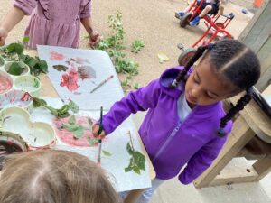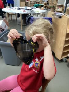 This week in the sewing area, inspired by their time spent outside in the garden, the children have explored sewing with natural materials. The children  helped to gather materials for their transient art and explored creating their marks on leaves with their stitching and added additional details with the addition of fabric embellishment. Whilst making their creations we discussed the different parts of the plant and how the seasons might affect them. We did some extra research using the ipads to explore different insects that might live on our plants and also explored some similarities between ourselves and leaves, looking at the finer details such as the veins on the leaves.