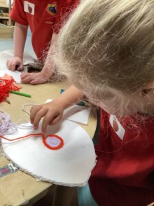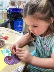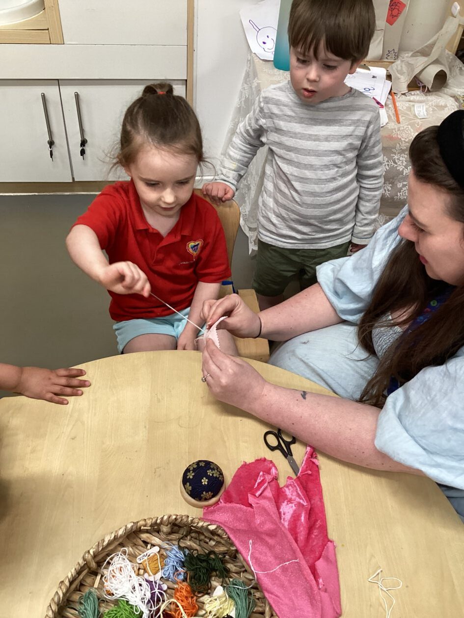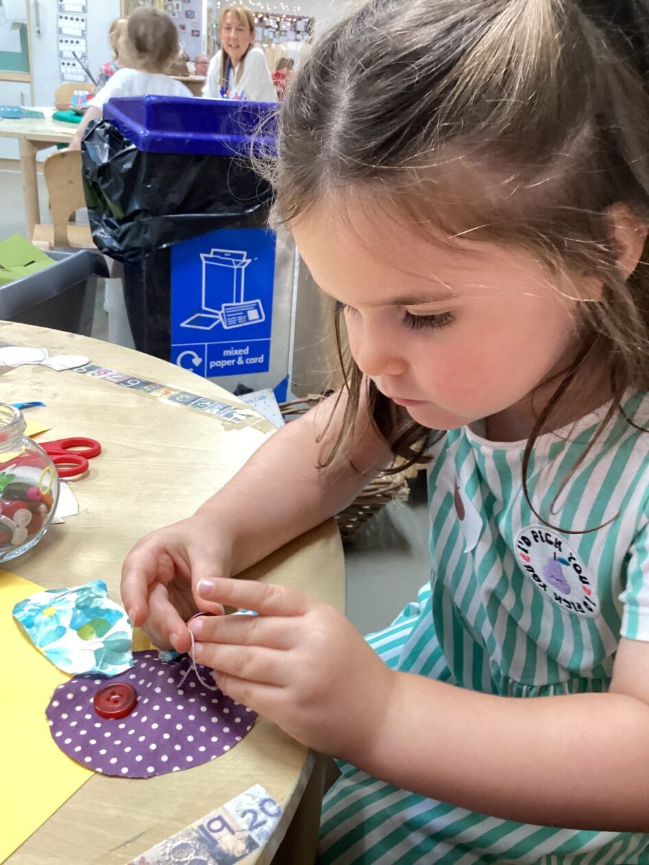 The children have also been working on their independent sewing skills as they made collages with the shapes. They chose which shapes and buttons to sew on to the foam and created their own pictures to take home.