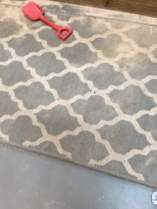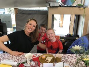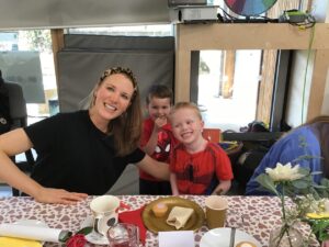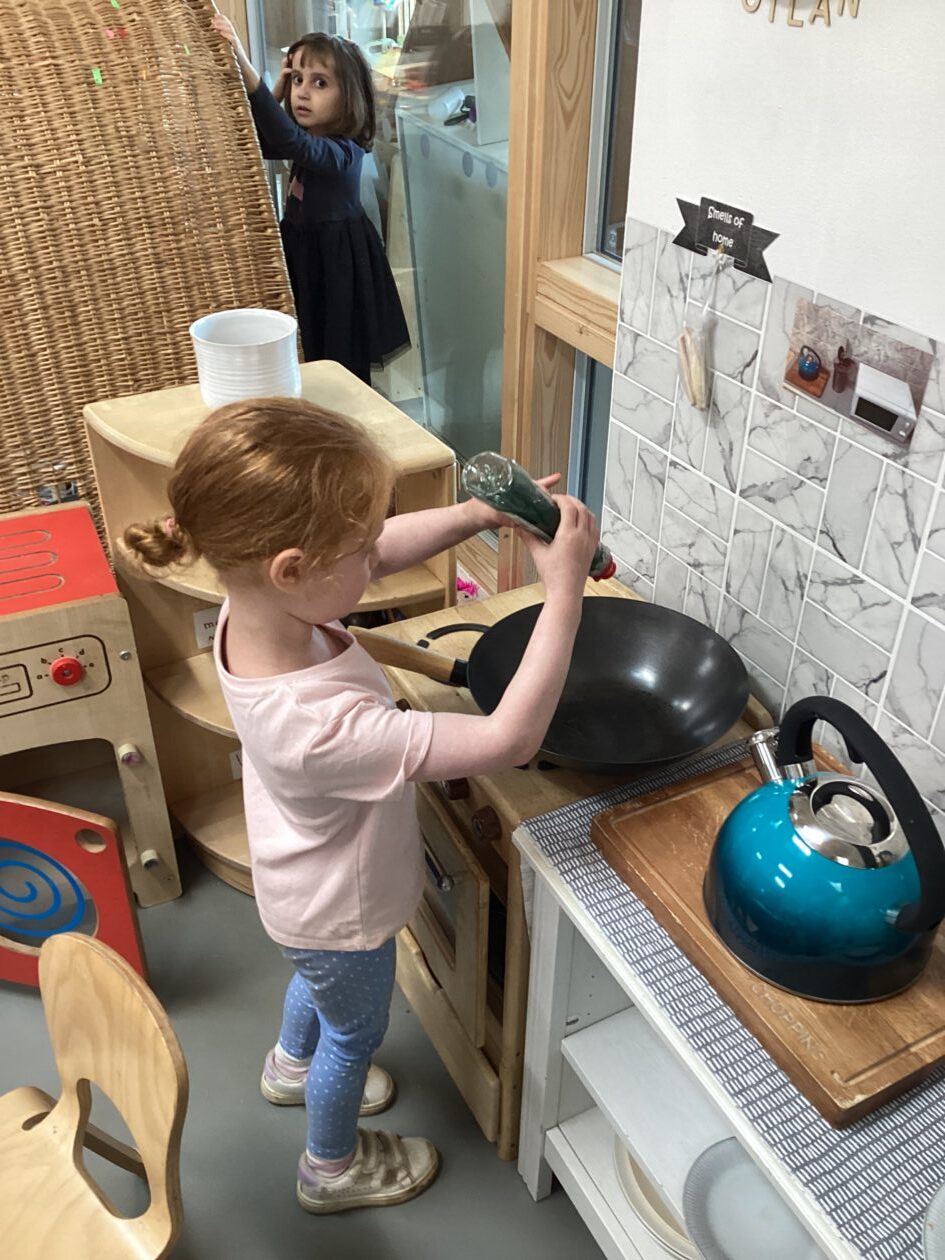 “Ready steady go! Three little eggs sitting in a pan one went crack and we put it in the bin, Two little eggs sitting on a pan one went crack and we put it in the bin, One little egg sitting in a pan, one went crack and we put it in the bin. All done.” – A.
