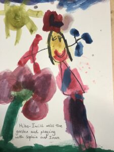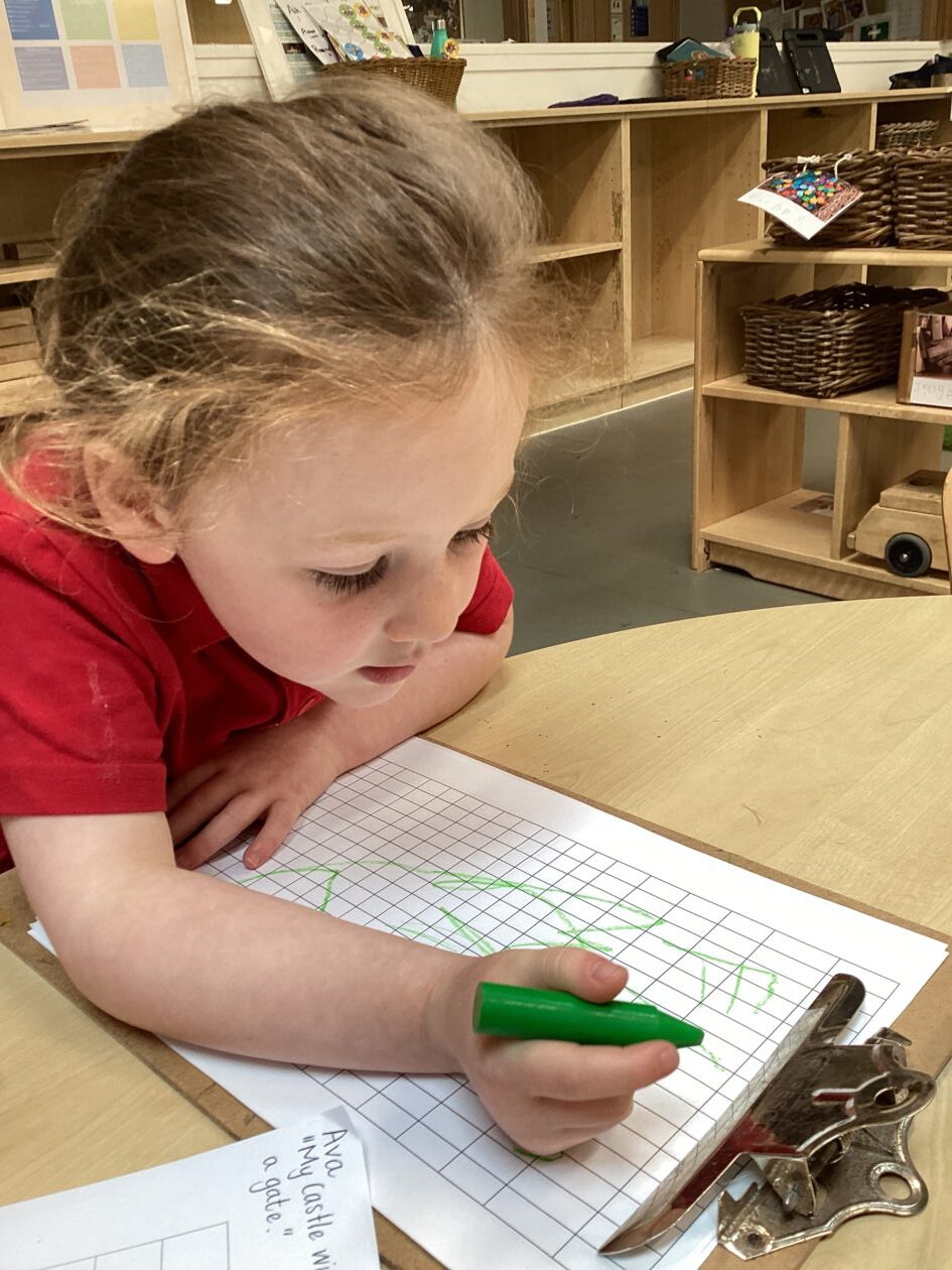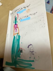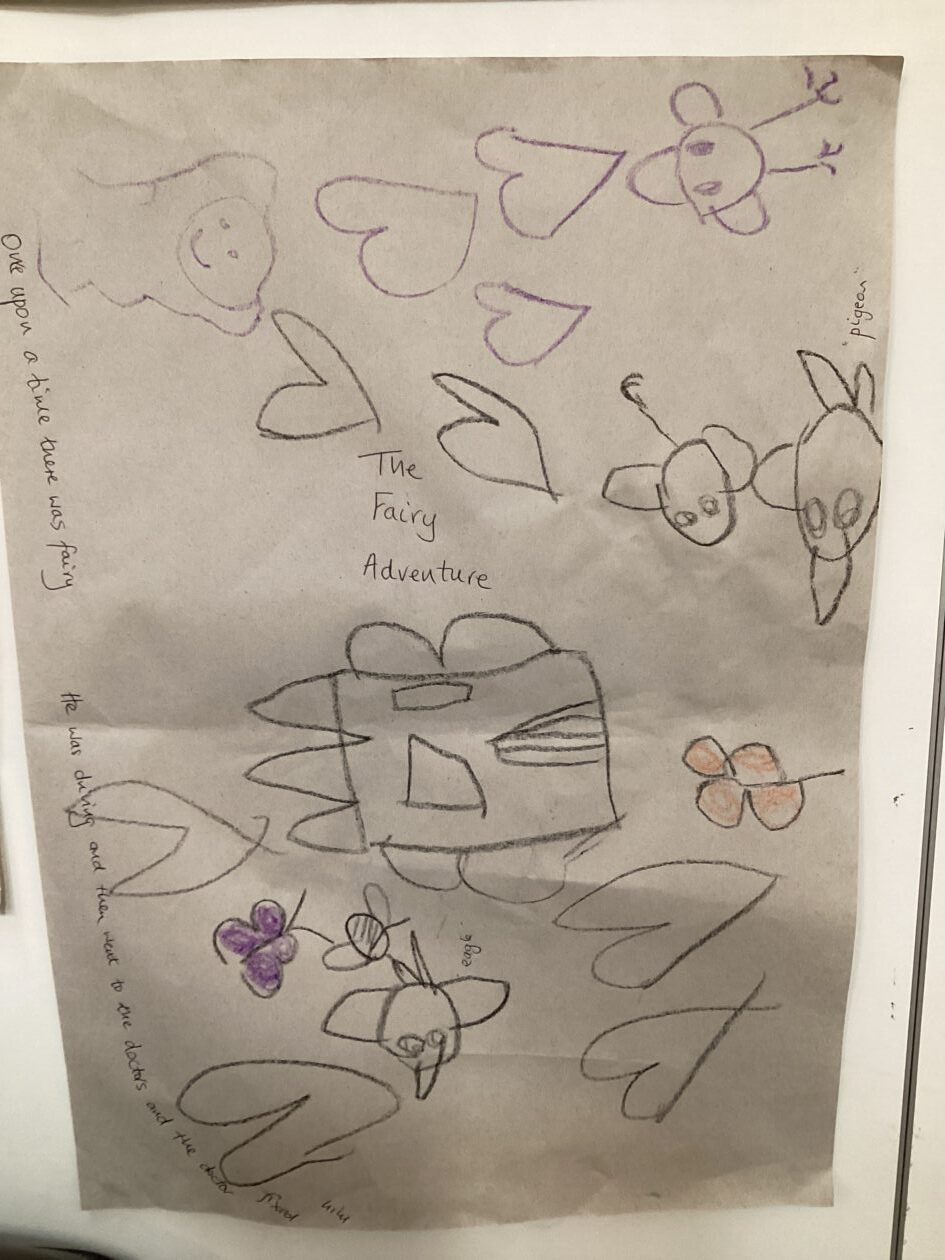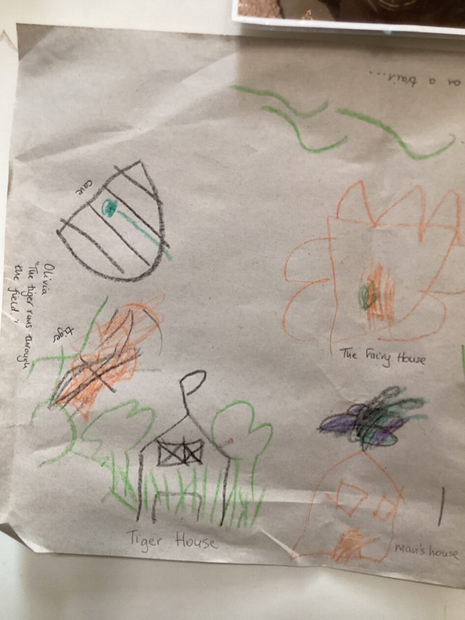 “Can I make up a story?” “Once there was a cottage and the queen was in the cottage and she saw a nice castle”. P.G.