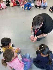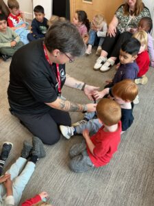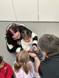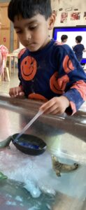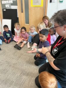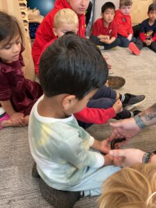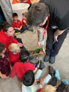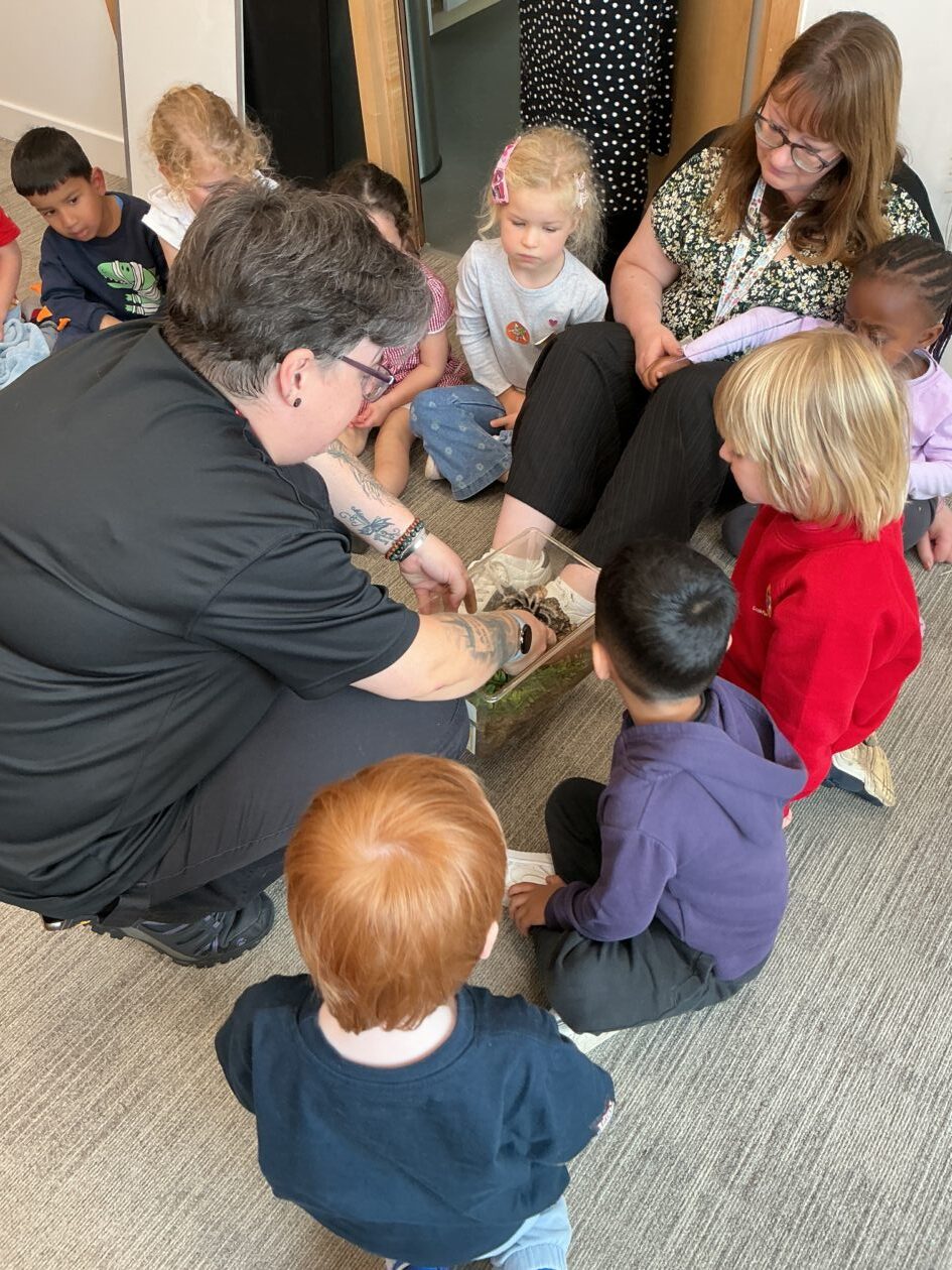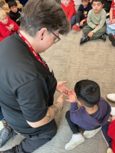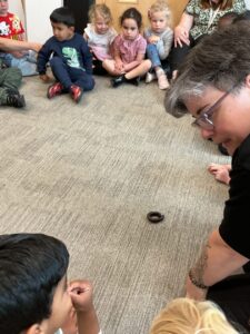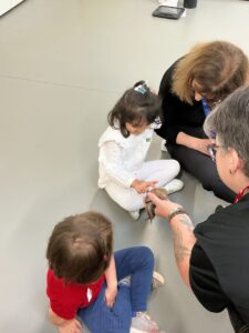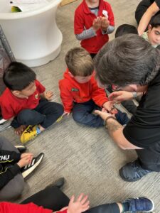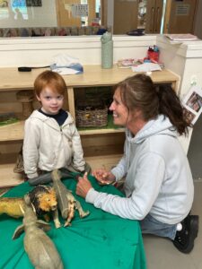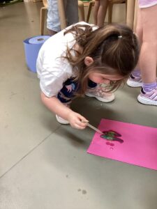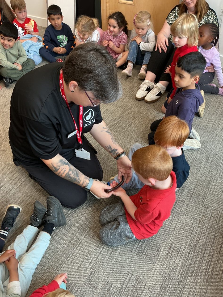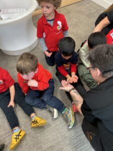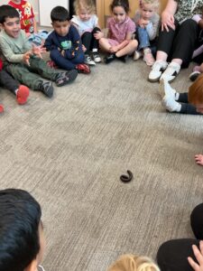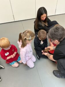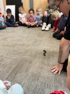 We learned that Dobbie can change from green to brown depending on which part of the tree he is on and that he loves to eat three crickets for this dinner. Another fun fact that we learned was how Dobbie uses his eyes to push his food down into his throat to help swallow what he is eating!! Dobbie’s croak sounded like a dog barking!