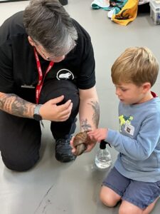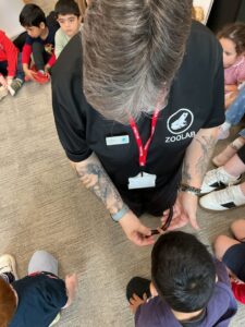 Next we met Ronald who was a Giant African Chocolate Millipede! Ronald doesn’t have good eyesight so he uses his antenna to find his way around. He only had six legs when he was born and now he has over 300! His skeleton is on his back which he can shed and then grow a new one!
