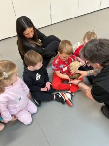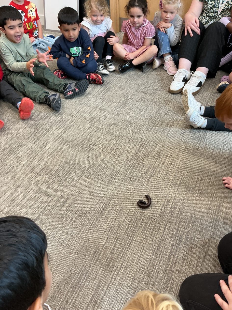 We met Squib the Snow Leopard gecko. We found out that Squib comes from the desert where there is lots of sand! Squib had a bumpy back and a smooth tummy. His bumpy back helps him from not getting hurt by the sand. We also found out that he can be hunted by predators and when he does he can drop off his tail! It will eventually grow back!