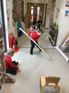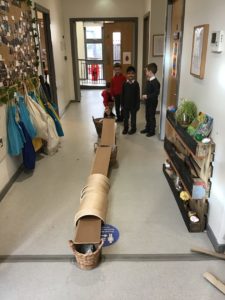 We have been gifted a load of cardboard tubes. So far this week, they have been (amongst other things) listening devices, hockey sticks, measuring devices and car ramps.
