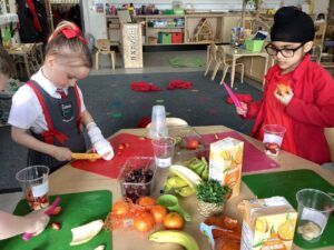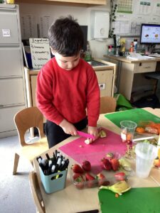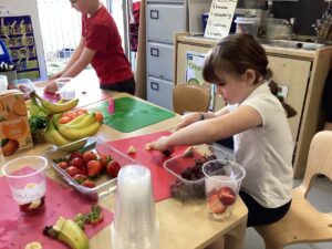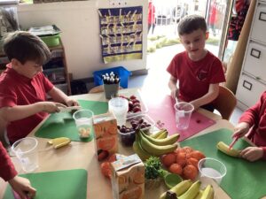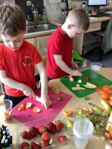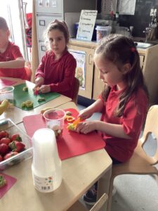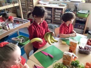 This week we have been learning about different types of fruit and have shared what we like and dislike with each other. We recognise the importance of eating fruit as part of a healthy diet and enjoyed preparing our own fruit salads developing our chopping, peeling and slicing skills.