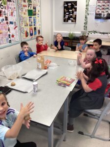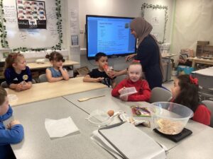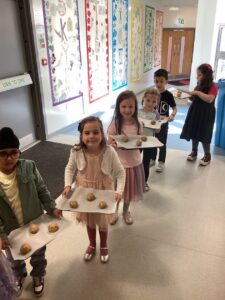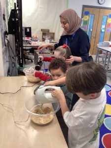 We have had a lovely day learning more about Eid Al-Fitr. Our day began preparing and baking chocolate chip cookies following Mrs Amin’s recipe. We worked together in small groups to measure out the ingredients and separate the mixture to create our cookies. The smell floating through the school as they were baking was delicious.