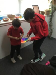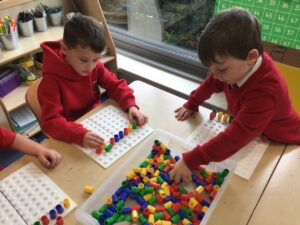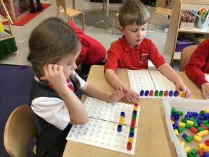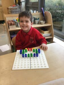 We then used the boards and coloured pegs to help create our own patterns with a line of symmetry.
