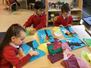 We used our knowledge of the seasons to create a calendar which we will be bringing home next week to share with our grown ups. We painted a tree and then used tissue paper to show the different colours we see on trees each season.