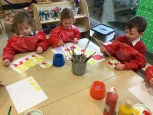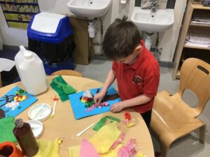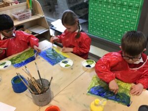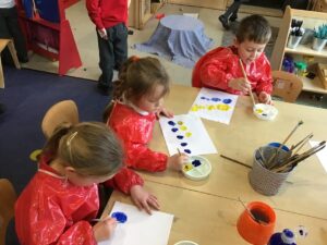 This week we started our block of learning about painting. We started by exploring the colour wheel and discussed the primary colours we can mix to make secondary colours. We had a go at mixing blue and yellow and used these skills to paint some balloons in blue, yellow and green.