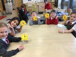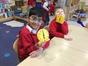 We also started learning about ‘o’clock’ this week. We have explored this on an analogue clock and practised making the time together. Next week we will complete our learning about Time by looking at digital clocks.