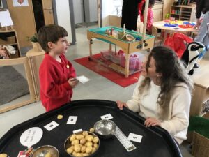 We have been learning about ‘more than and less than’ in class and demonstrated this at the tuff spot. We could count out the potatoes to help us.