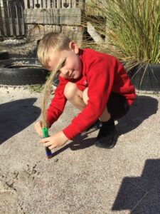 In Primary 1 we initially learn to write through drawing and are encouraged to add as much detail as possible to our drawings. This week we drew a picture to match the sentence ‘I am splashing in the puddles.’