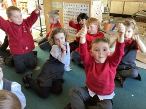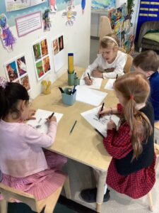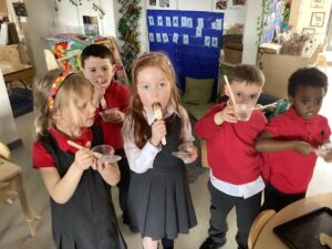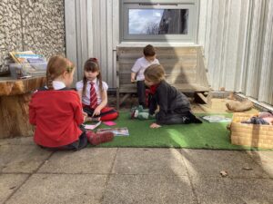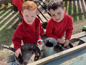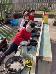 This week we had so much fun playing in the garden and enjoying the sunshine.  We read stories together trying to spot magic e words, used bright spring colours to draw collaboratively on the ground and made some delicious recipes in the mud kitchen. Hopefully the weather will continue into next week so we can enjoy some more outdoor learning.