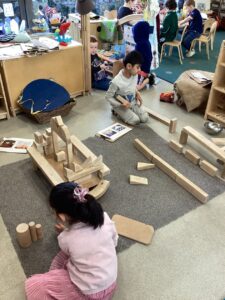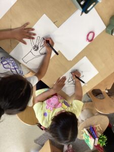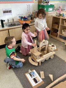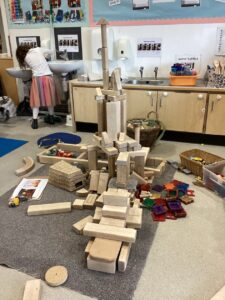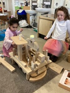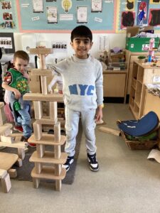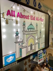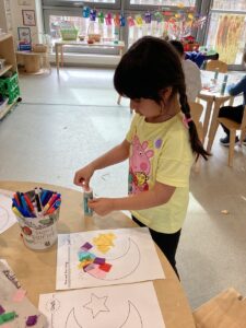 Today we enjoyed learning more about Eid in the classroom and listening to some of our friends sharing their experiences from home. We looked at some pictures of mosques and after chatting about the features of the building tried to build our own in the block area. We used tissue paper to collage designs on crescent moon and stars and tried our first attempt at henna designs by drawing around our own hands.
