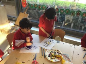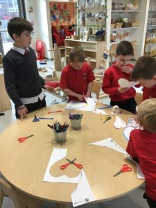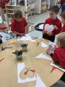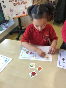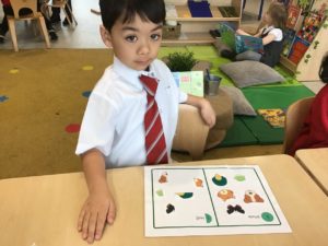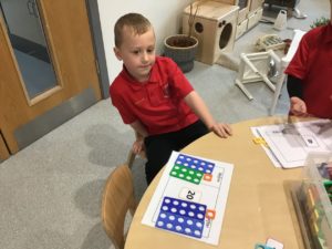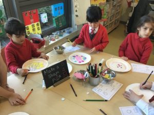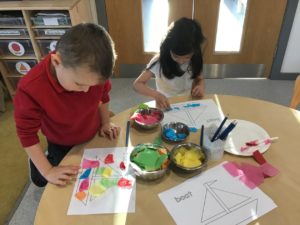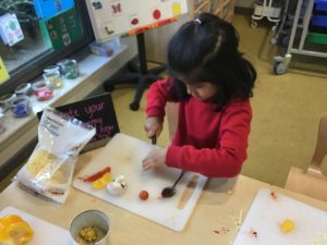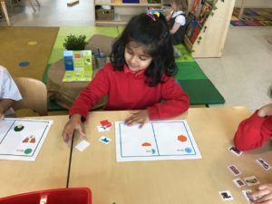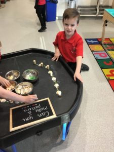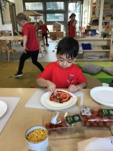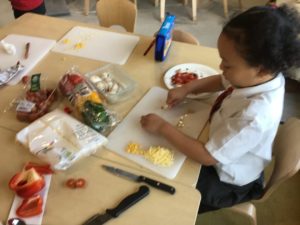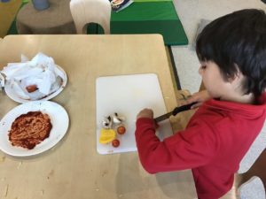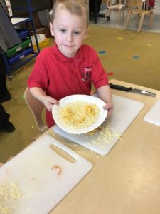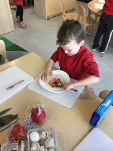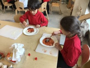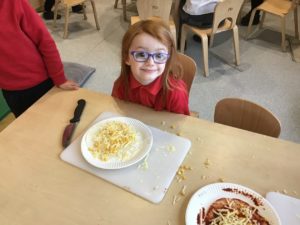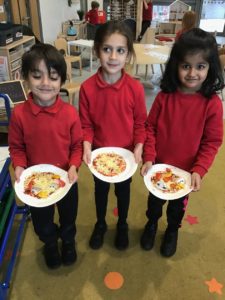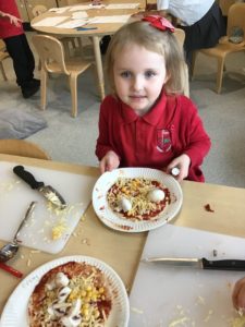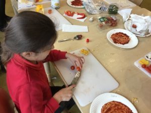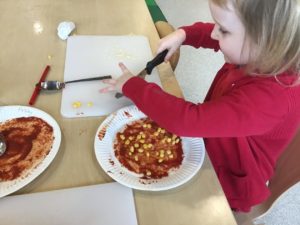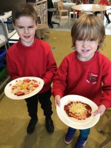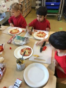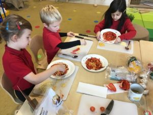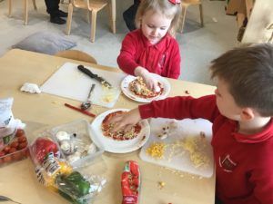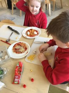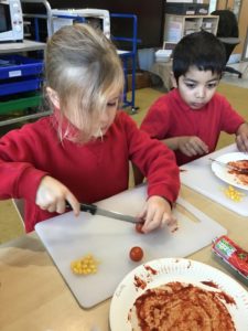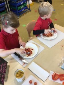This week, we made some tasty pizzas to help develop our understanding of halves. While we were preparing our pizzas, we spoke about trying new foods and how some of our friends or family may eat different foods from us. We made sure that we were very careful when we were chopping our vegetables and we also had to think carefully about where we were cutting our vegetables so that we had equal halves. All the pizzas looked yummy and I am sure they tasted as good as they looked! We have also been enjoying a range of other activities to help us identify halves.