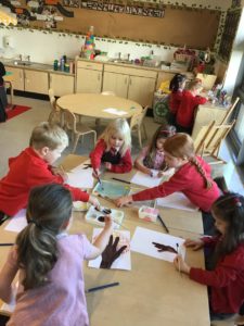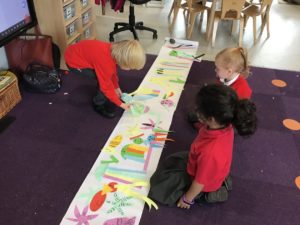 We have enjoyed exploring colour and looked at how we mix colours to create new ones. We have also looked at how the season is changing and we have noticed that the leaves are starting to fall of the tree and we were inspired by this to create a lovely Autumn painting.
