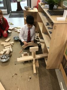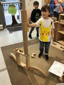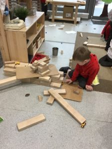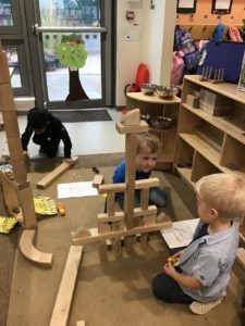 We have been building more than ever in our construction area and some of us are even drawing our designs and then creating and measuring them. We love using cars, pebbles, dinosaurs and lots of other items in our buildings.