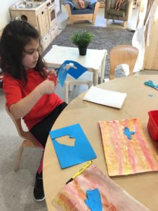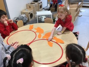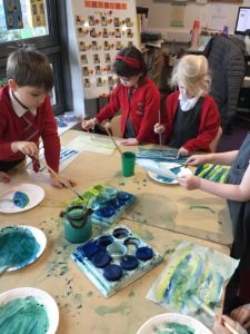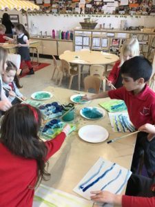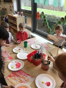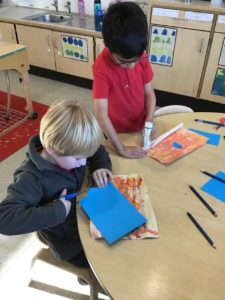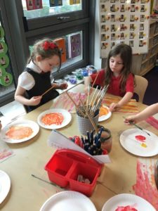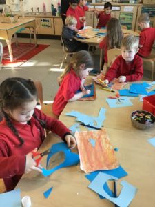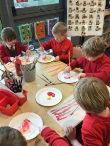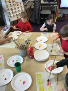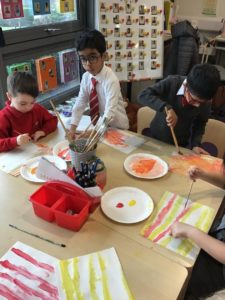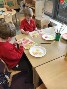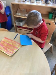 We have continued to enjoy painting and have been mixing red and yellow to make orange. We painted red and yellow houses and then mixed the colours to create some orange houses. We then used these skills to create a sunset picture and made some blue birds to fly across our sunset.