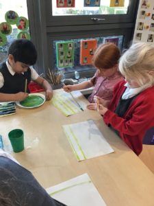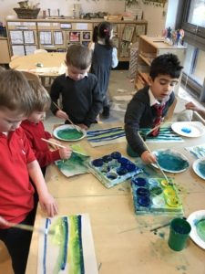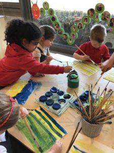 We have continued to enjoy painting and have been mixing red and yellow to make orange. We painted red and yellow houses and then mixed the colours to create some orange houses. We then used these skills to create a sunset picture and made some blue birds to fly across our sunset.