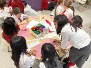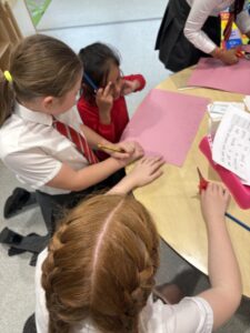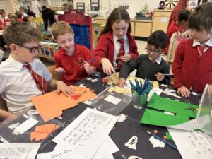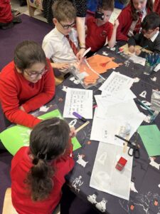This week P1C were so excited to visit our P6 buddies. P6C were fantastic role models for us and showed us their learning journey all about light and our first learning journey of P6.  P6 created four stations for us to rotate around including a clay symmetry display, shadow puppets, presentation posters that they made with Adobe Express and their jotters too.