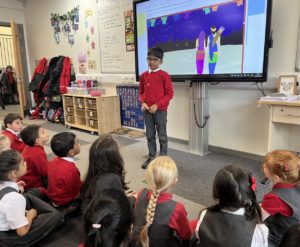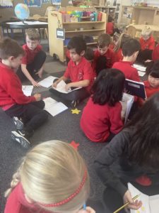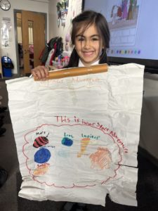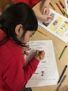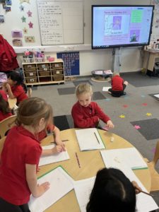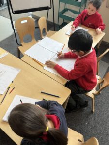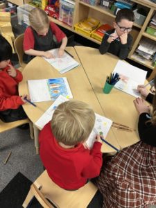 We chose a character and then retold their story. I drew a picture then wrote about it in my jotter. – L