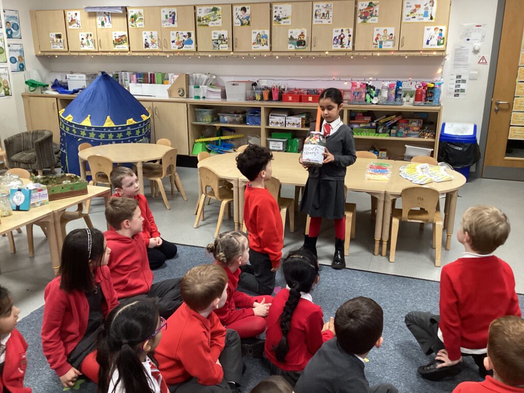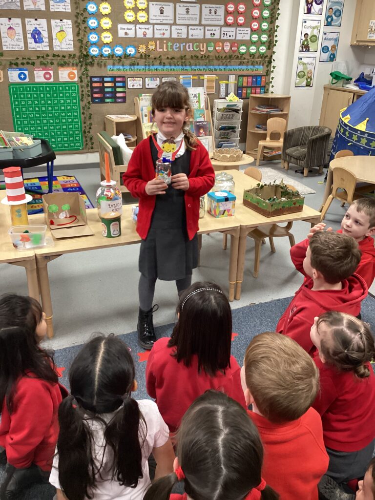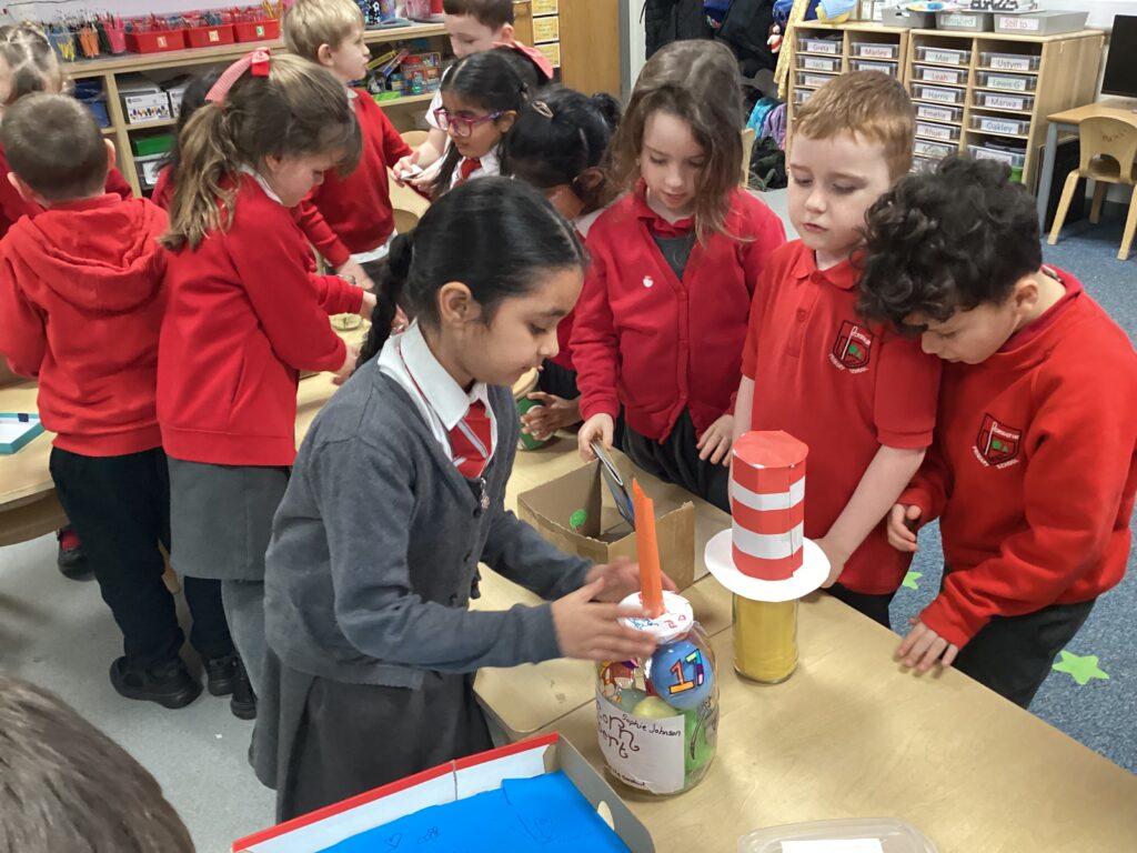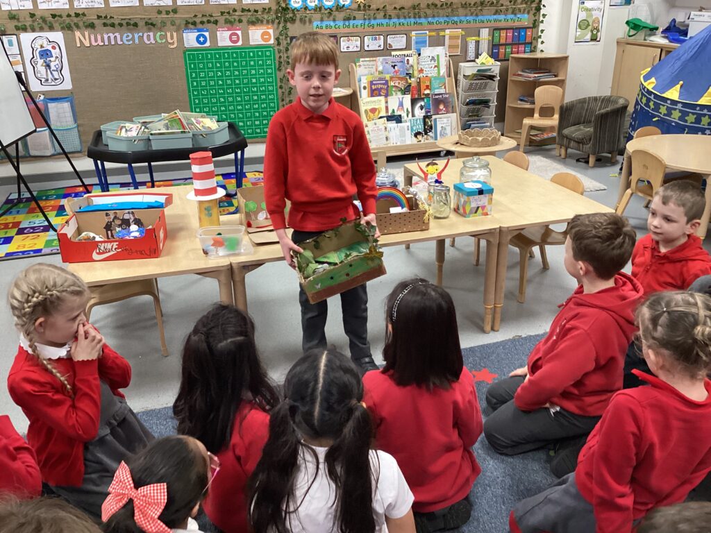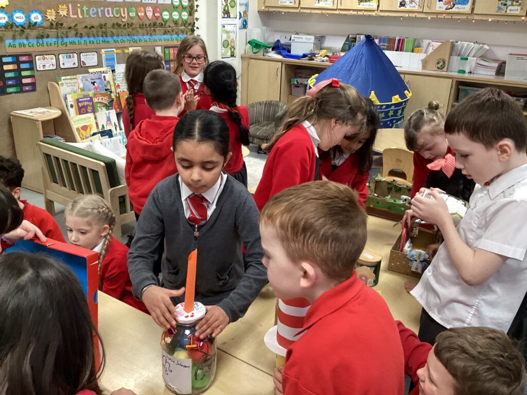 We love to explore the world of books and storytelling in P2b and today was full of sharing our imaginations and creativity. The ‘Story in a box/jar’ competition entries were fantastic and the children had a very sociable and fun time together looking at these together in class and taking part in the school book swap.
