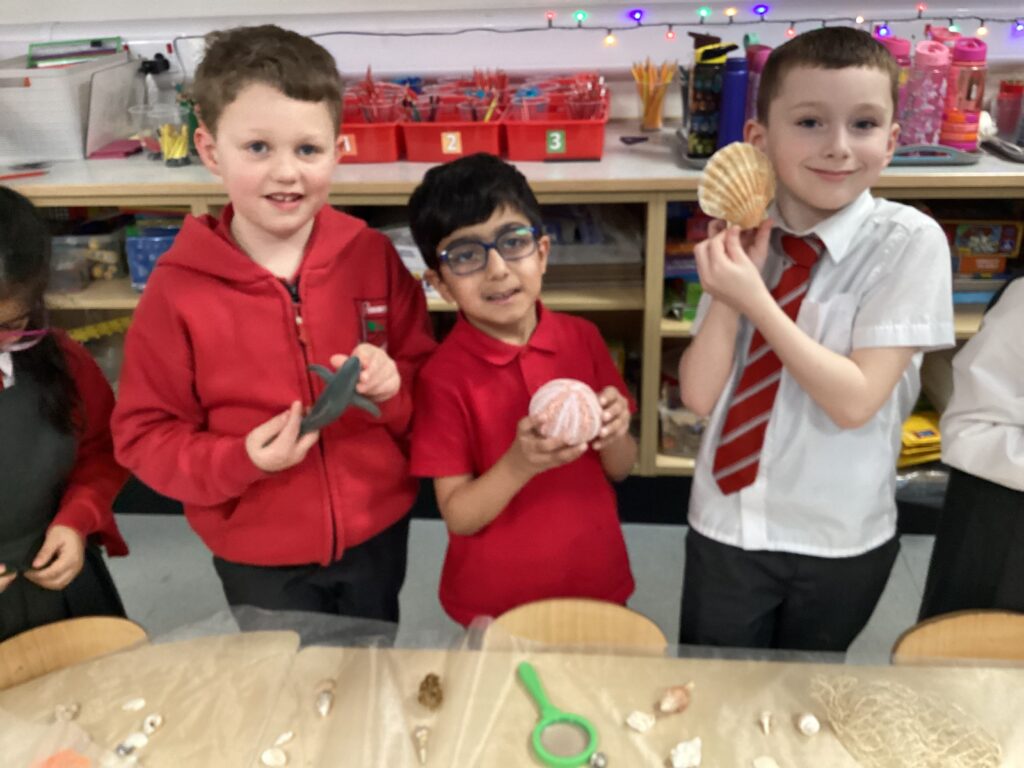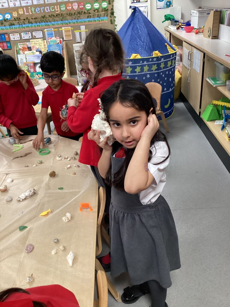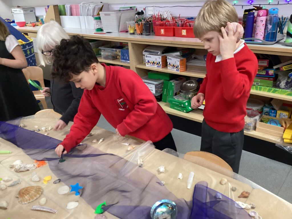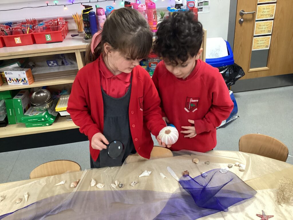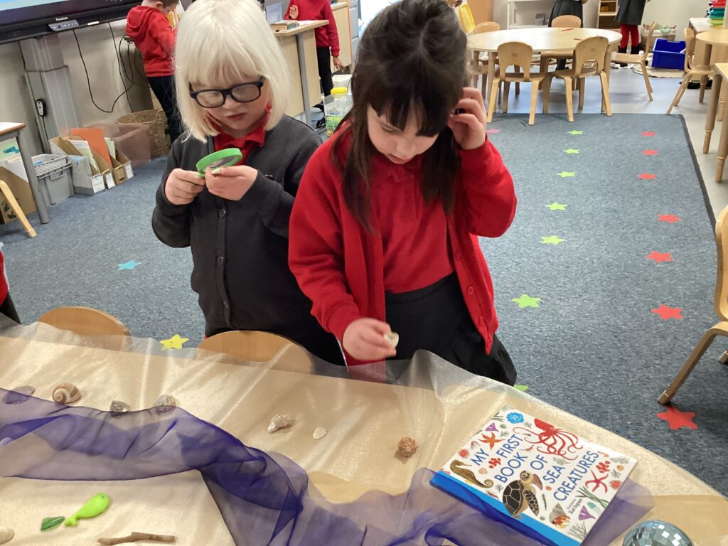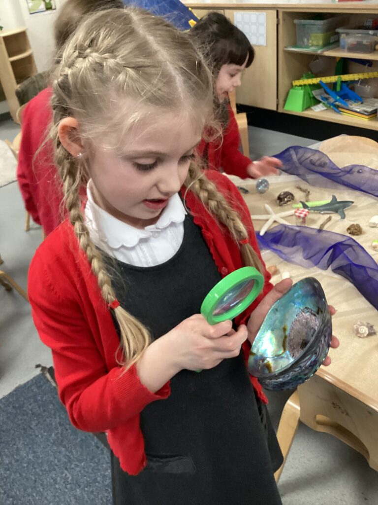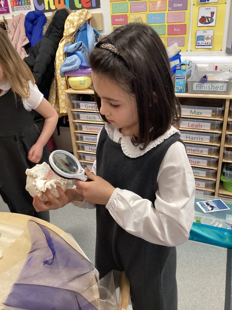We loved finding out more about what seashells are made of and distinguishing different types using our magnifying glasses and matching these to our description charts.