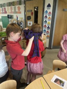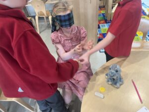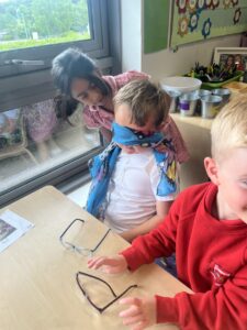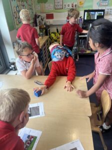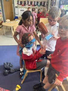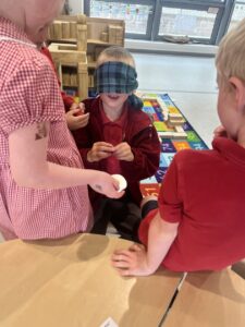 As part of our lessons on our senses we worked in groups to try to identify different objects from around the room without looking at them. It was great to see such teamwork and communication to help us each other identify the objects.
