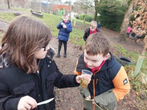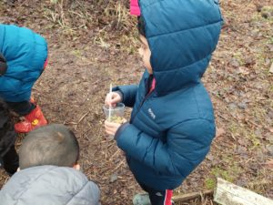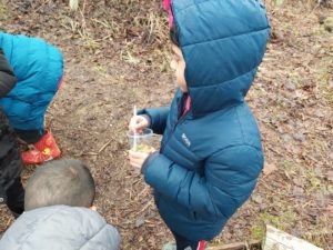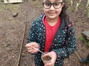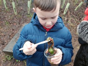 Kerr – In the Woodland we made a smelly potions to help us discover the smells of different plants and things in the woodland. I even found some sort of vegetable in the ground.