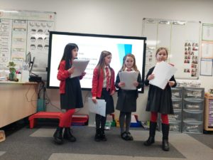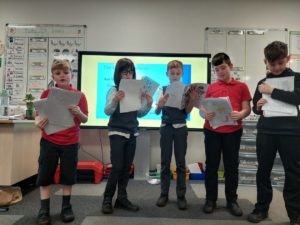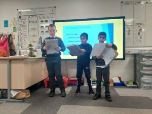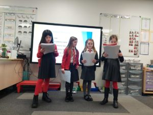 Harrison – At assembly today some of the people from our class went up to present their Scots poems that we made on Thursday and Jace went up to say some Scots words and test the adults.