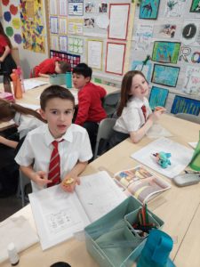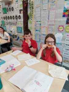 Scarlett – In Art, we were given sweeties and we had to draw them. After we sketched them out we used charcoal to create different textures. Then we got to eat fresh sweeties!