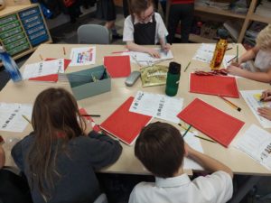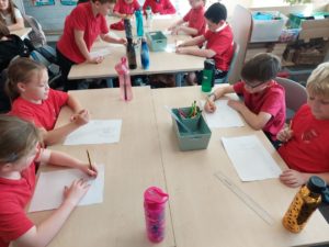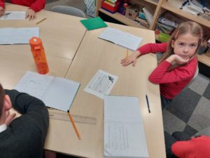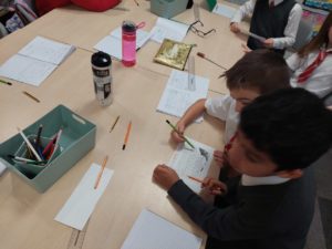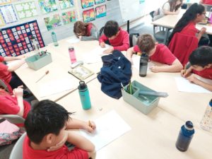 Luca V – In Writing we were choosing one of our best pieces of writing – we could choose from our beach or jungle settings and redrafted it on to a piece of paper and created a nice border.