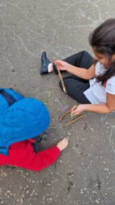 We used our TWMTDW skills to make large shapes. We made triangles, rectangles, (almost) squares and irregular quadrilaterals. We also learned a game called Nim and played it with wild materials.