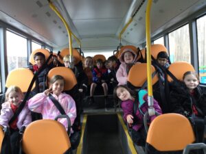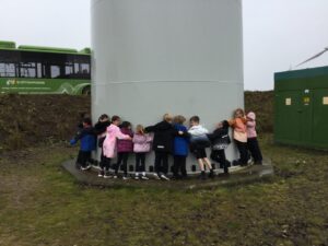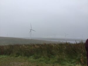 “Stewart the driver told us lots of facts about the wind turbines.  The blades on the turbine are made of wood.  The nose cone rotates to face the wind. If you put your ear to the turbine, you can hear the energy being produced”  Minna