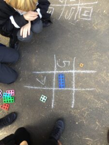 We have learned how to play maths games in the playground using a mixture of natural resources and basic resources.  These are games we can now play at break and lunch too.
