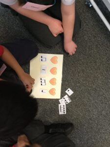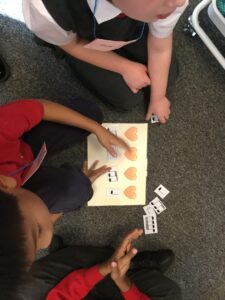 We used chalk and Numicon to play the game ‘Fifteen.’ Like Tic-Tac-Toe, you need to make a row of numbers total 15.
