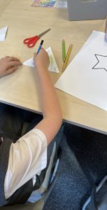 Sophia – We created time capsules which we will open at the end of primary 5/6. First we wrote a letter to our future self, then measured our heights using string, drew around our hands and took a photograph of each other. Afterwards, we sealed these items in our decorated envelopes.