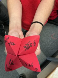 This week, we made fortune tellers to celebrate Lunar New Year.  We wrote “Happy New year” on the outside in Chinese characters and then chose numbers for the inside.  Then, we created some new year messages.  The number 0 was definitely the most challenging!