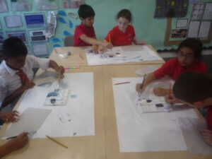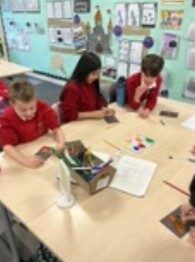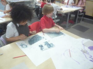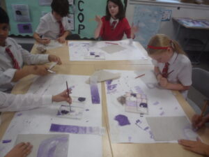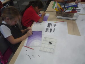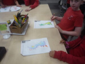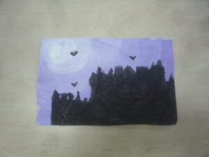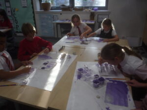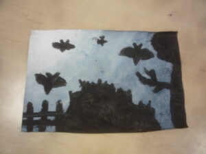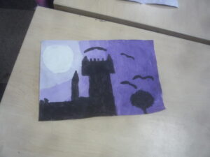 In Expressive Arts we practised our tinting skills to make beautiful sun or moon backgrounds for silhouettes of Scottish Castles, concentrated on shape and line work.  They look fabulous!