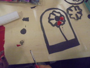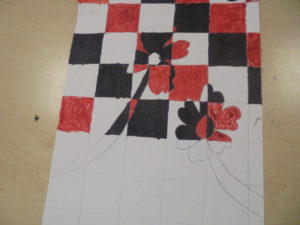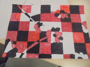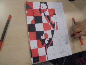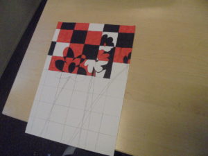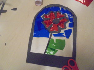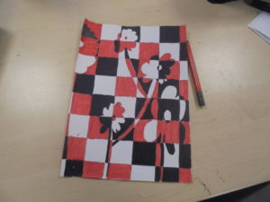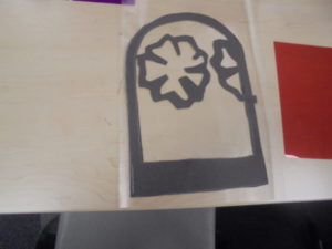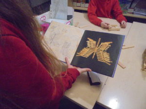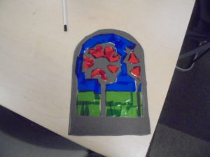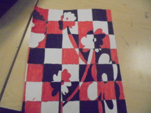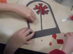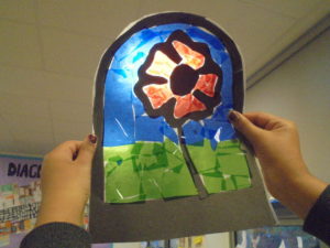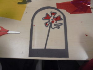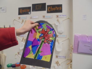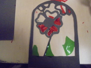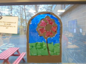 Yesterday, P7’s came back to our class and we did some Christmas art. We drew a Christmas tree template and then cut it out and put it on a piece of card and then we painted designs on the card around the tree. Then we took the Christmas tree template off and it looked like a white Christmas tree with a coloured background. – Varda