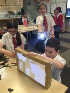 Extending our learning and understanding further, we created Newton’s colour wheel. We learned how to use a compass to draw a circle and used our knowledge of fractions to create segments. We had fun experimenting with dispersion of white light.