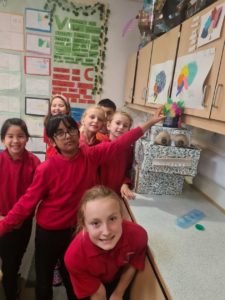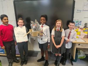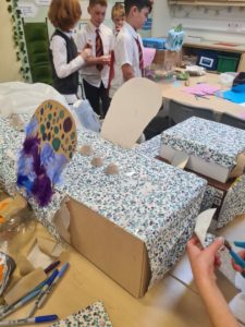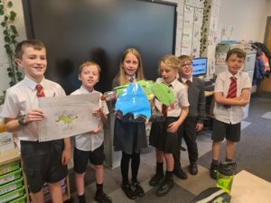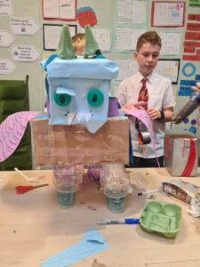 ‘Our Dragon was called Bubble Beans, he is a blue bean dragon. We stuck cardboard boxes together, covered them in paper with a design. We put lollipop sticks under the wings so they could stick out and then we stuck it all together. It was fun!’- Callum