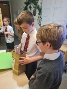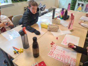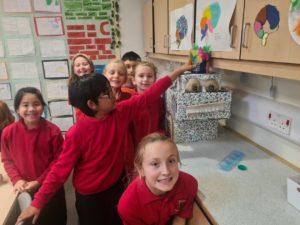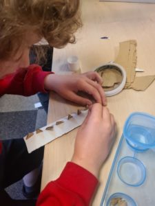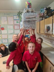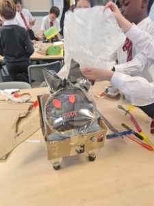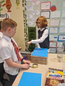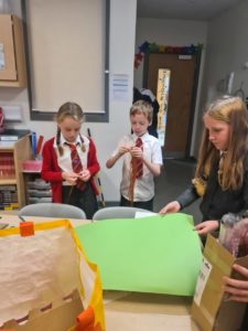 ‘Our Dragon was called Bubble Beans, he is a blue bean dragon. We stuck cardboard boxes together, covered them in paper with a design. We put lollipop sticks under the wings so they could stick out and then we stuck it all together. It was fun!’- Callum