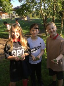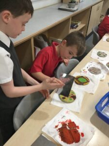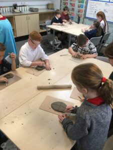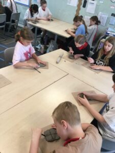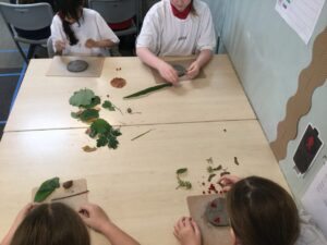 • We continued learning about symmetry and created symmetrical clay models using things we found in the Woodland.  We created prints with natural resources and explored lines of symmetry.  We plan on painting them in a couple of weeks.