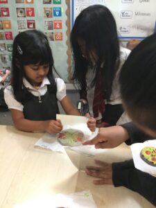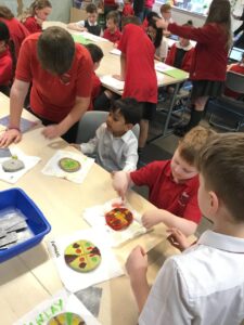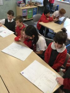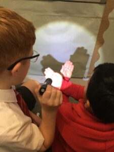 This week was our final time learning about light and our first learning journey of P6.  The class decided to showcase their learning and invited their P1 buddies to provide them with an opportunity to share their learning.  The class created four stations including a clay symmetry display, a chance for the P1’s to create puppet shadows, they shared their presentation posters that they made with Adobe Express and they shared their jotters too.