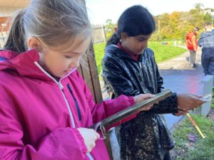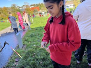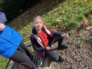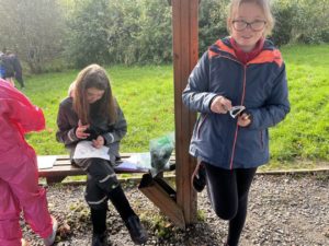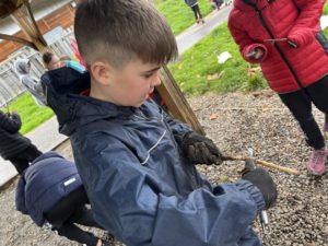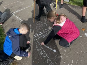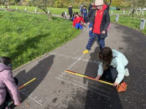 In the woodland both classes were joined together and we were split into three groups to do different activities. Such as… knot tying, stick whittling (with potato peelers), drawing grids and marking coordinates with chalk and metre sticks and then simply playing in the woodland.