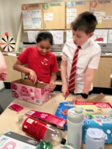 Boat challenge – In teams of 5, we had to solve a problem. We needed to use recycled materials to create a boat that would hold toy animals without sinking!